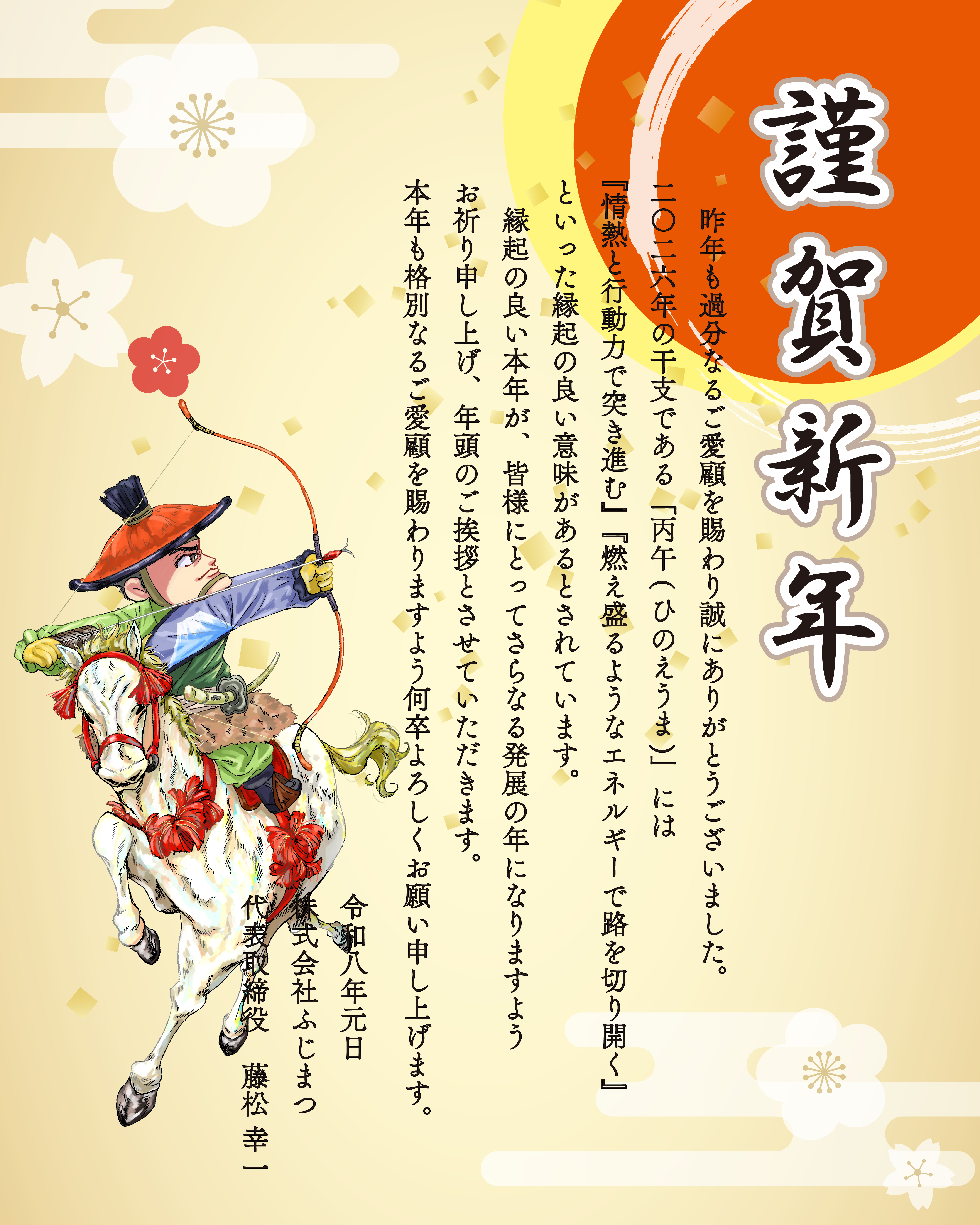 新年明けましておめでとうございます。 皆様には、健やかに新春を迎えられたことと、お慶び申し上げます。 また、旧年中はひとかたならぬご厚情を頂きありがとうございます。 2026年も、社員一同一丸となりサービス向上に尽力して参ります。 皆様のご健勝とご発展をお祈り申し上げます。 本年もどうぞ宜しくお願い申し上げます。